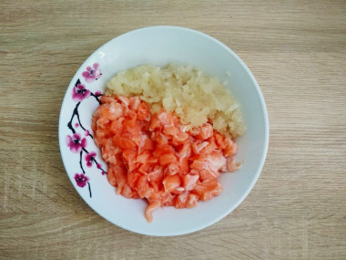 Филе горбуши соедините с луком, добавьте специи, посолите. Полейте растительным маслом, чтобы начинка была сочнее. Если вы используете готовые смеси специй, обязательно прочитайте на упаковке состав. Часто в таких смесях уже присутствует соль, учитывайте это, чтобы не пересолить начинку.