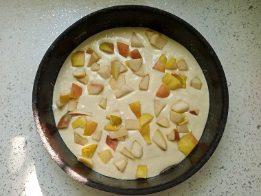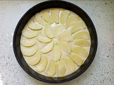 Вылейте в форму половину теста. Разложите на него дольки яблок по кругу.