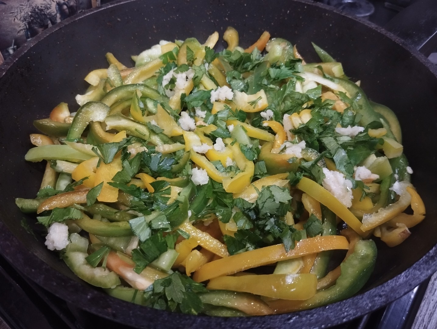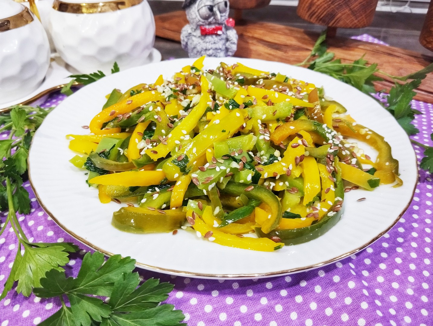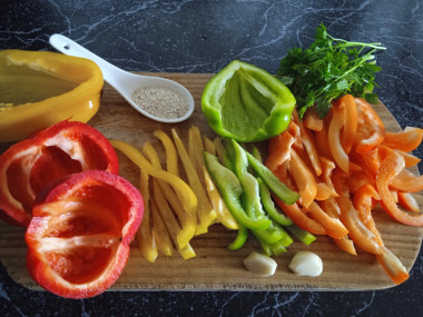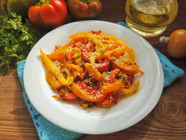 Болгарский перец я выбрала разных цветов - красный, оранжевый, зелёный и жёлтый. Почистила и порезала перец. Потомила на сковороде на подсолнечном масле без запаха. Перец сохранил и цвет, и форму. После того как я добавила чеснок в сковороду - запах стоял фантастический! Тогда я прям со сковородки и попробовала, уж больно аппетитно пахло) Уже вкусно! Из зелени я выбрала свежую петрушку, положила в конце. Посолила салат ещё на сковороде морской солью и немного поперчила свежемолотым перцем. Выложив на тарелки теплый салат, присыпала обжаренным кунжутом. Сразу подала на стол, пока теплый)