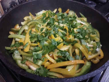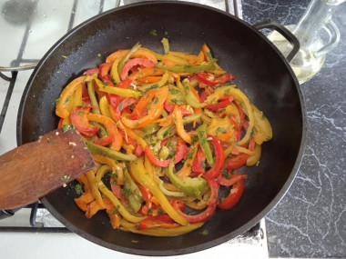 Добавьте в сковороду к перцам пропущенные через пресс зубчики чеснока. Посолите по вкусу. Жарьте все вместе, помешивая, 1 минуту. Уберите сковороду с огня.