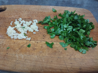 Укроп и петрушку вымойте, отряхните от влаги и мелко порубите. По желанию можете заменить или дополнить другой зеленью, например, кинзой, зеленым луком или использовать смесь разных трав.