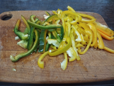 Болгарские перцы вымойте, обсушите, очистите от семян и плодоножки. Нарежьте перцы соломкой.