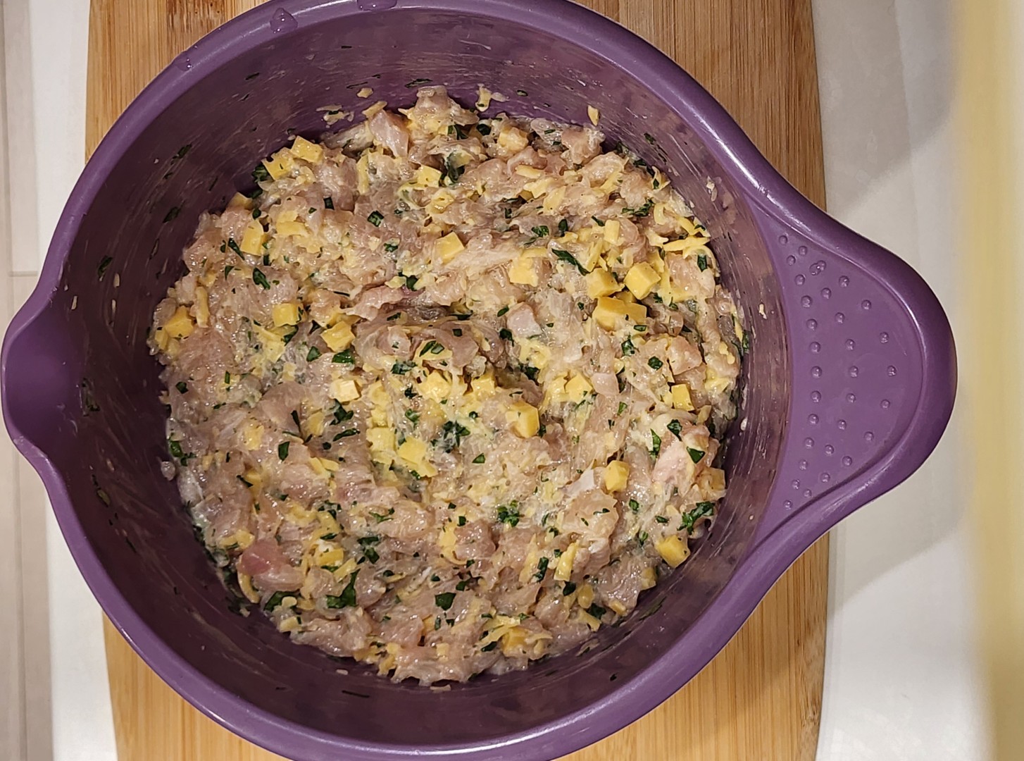 Куриное филе я порубила ножом, порезала сыр на мелкие кубики, добавила его и все остальные ингредиенты к курице и тщательно вымесила фарш руками. Первую партию жарила на чугунной сковородке, смазанной маслом. К сожалению котлетки немного разваливались на кусочки и подтаявший сыр начал прилипать к сковороде. Но я не отчаялась и примерно треть фарша пробила в кухонном комбайне помельче, чтобы эти мелкие частички облепили более крупные кусочки. Очень боялась, что котлеты снова прилипнут, поэтому сковороду сначала как следует разогрела, только потом налила масло и спустя примерно минуту выложила фарш ложкой. Жарила на среднем огне. И теперь всё получилось!