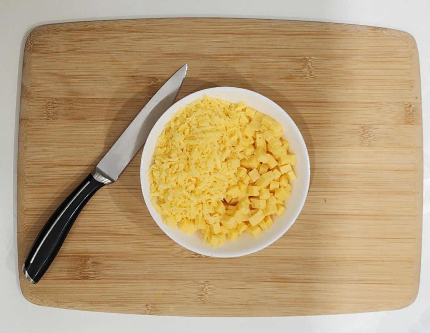 Сыр разделите пополам. Одну половинку нарежьте кубиками, другую натрите на крупной терке. Это делается для того, чтобы сыр лучше расплавился, но при этом все-таки остались крупные кусочки. Если вы используете мягкий сыр типа брынзы, то просто порежьте его, не натирайте.Шаг 6: