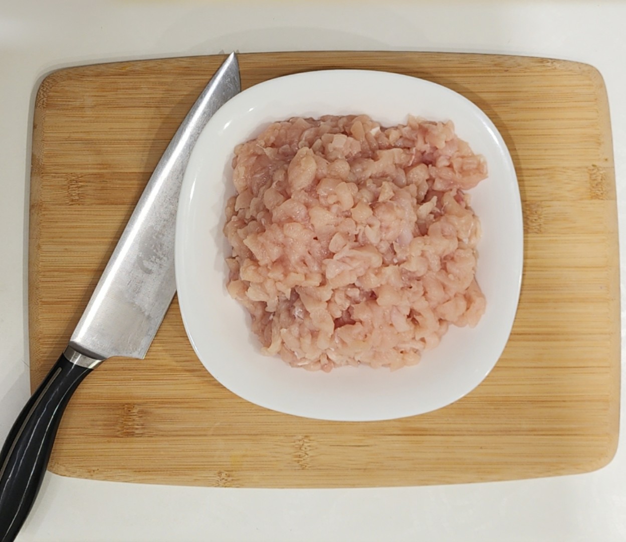 Филе обмойте и хорошо обсушите. Нарежьте его на очень мелкие кубики. Для этого сначала нарежьте мясо на тонкие пластинки, которые, в свою очередь, на полоски, а уже их на кубики. Это на самом деле займет не так много времени, как кажется, главное хорошо наточить нож.Шаг 3: