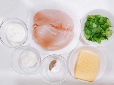Как сделать рубленные куриные котлеты с сыром? Подготовьте продукты. Для этого рецепта лучше всего подходит грудка или бедра курицы, мясо с нее самое мягкое и быстро готовится. Понадобится как раз одна грудка или два филе. Сыр можно брать любой, это не принципиально. Кефир можно заменить на комбинацию кефир+майонез. Зелень подойдет любая вами любимая, как и специи. У меня укроп/петрушка и перцы красный/черный.Шаг 2: