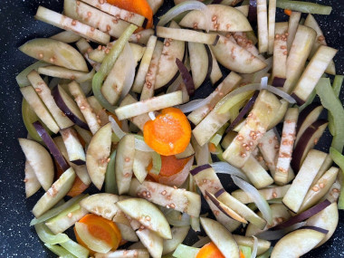 Затем закиньте баклажаны и мелко нарезанный зубчик чеснока. Перемешайте. Баклажаны сразу впитают в себя все оставшееся масло.
