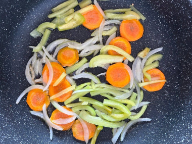 Разогрейте на среднем огне сковороду, налейте на нее растительное масло для жарки. Выложите лук и морковь. Обжаривайте их, помешивая, пару минут, до размягчения.
