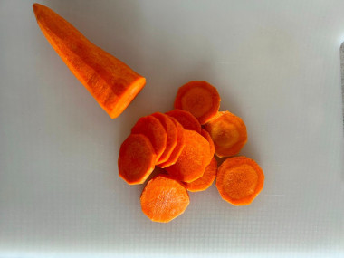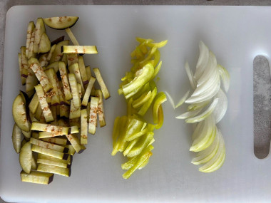 У баклажанов отрежьте хвостик. Сами плоды нарежьте сначала на пластины, затем их — соломкой. Обратите внимание, что в некоторых случаях нет необходимости в удалении горечи из баклажанов —обычно не горчат молодые овощи, а также некоторые особые их сорта.