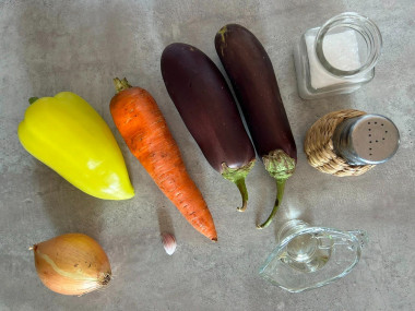 Как пожарить баклажаны с перцем болгарским и чесноком? Подготовьте продукты. Количество баклажанов зависит от их размера, я взяла три маленьких, если плоды средние, то возьмите два. Все овощи помойте, лук, морковь и чеснок очистите.