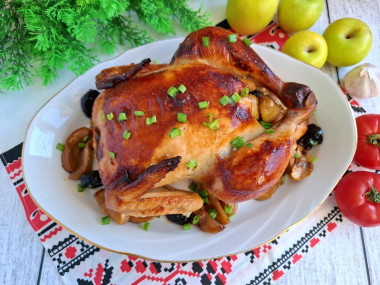 Курица фаршированная черносливом с яблоками готова! Извлеките её из духовки, переложите на блюдо и подавайте к столу в горячем виде! Приятного аппетита!