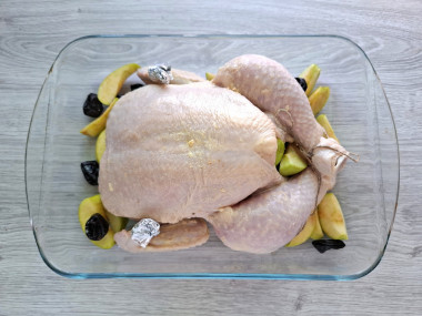 Форму застелите фольгой и выложите на неё курицу. Часть яблок и чернослива разложите вокруг. Прикройте верх фольгой, чтобы не начало подгорать. Герметично не упаковывайте. Поставьте в разогретую до 180С духовку примерно на 1 час. Затем снимите фольгу и оставьте курицу ещё на 15-20 минут в духовке до зарумянивания. Время указано приблизительно. Узнать об особенностях работы духовок и о формах для запекания можно из отдельных статей, ссылки в конце рецепта.