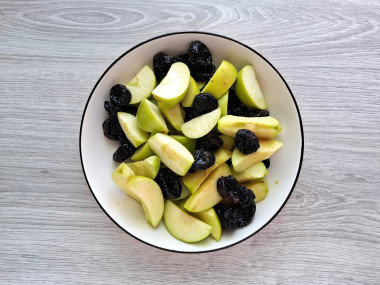 Помытые яблоки нарежьте ломтиками, удалив плодоножку. Чернослив пролейте горячей водой. В случае, если вам попался чернослив обработанный маслом, лучше всего будет залить его кипятком, дать постоять минут 10-15, затем слить, промыть горячей водой и обсушить.