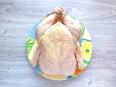 Тушку курицы ополосните в проточной воде и обсушите бумажными полотенцами от лишней влаги. Затем полностью обмажьте её получившимся маринадом. Можно оставить на пару часов, чтобы курочка промариновалась.