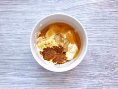 Пару зубчиков чеснока очистите и пропустите через пресс сразу в чашу. По вкусу добавьте соль, сахар и специи. Я добавляю готовый набор специи для курицы. Все ингредиенты смешайте между собой.