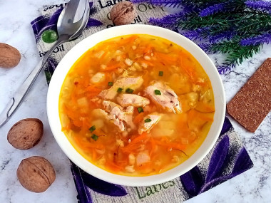 Набухшую перловку лучше всего отварить отдельно минут 30-40, а потом готовую добавить в суп, чтобы она не сделала бульон мутным.