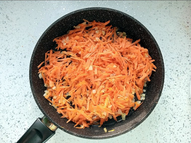 В это время очистите лук и морковь. Лук мелко нарежьте, а морковь натрите на терке. На горячую сковороду налейте немного растительного масла и обжарьте лук с морковью 3-5 минут.