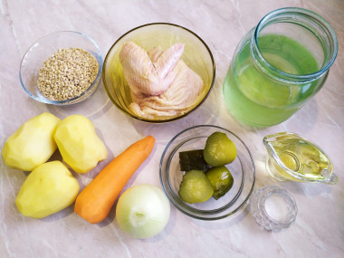 Как сварить рассольник с курицей и перловкой? Подготовьте для этого необходимые ингредиенты. Для варки супа можно использовать любые части курицы. Картофель заранее очистите от кожуры и ополосните от загрязнений.