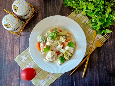 Курица с брокколи в сливочном соусе на сковороде это замечательный вариант лёгкого и вкусного ужина. Готовится просто, гарнир и мясо в одной посуде. Я сделала объем побольше в казане. И добавила ещё немного кабачка. Цвет овощей побледнел, но само блюдо получилось очень аппетитным и нежным с приятным сливочным вкусом. Спасибо за рецепт!