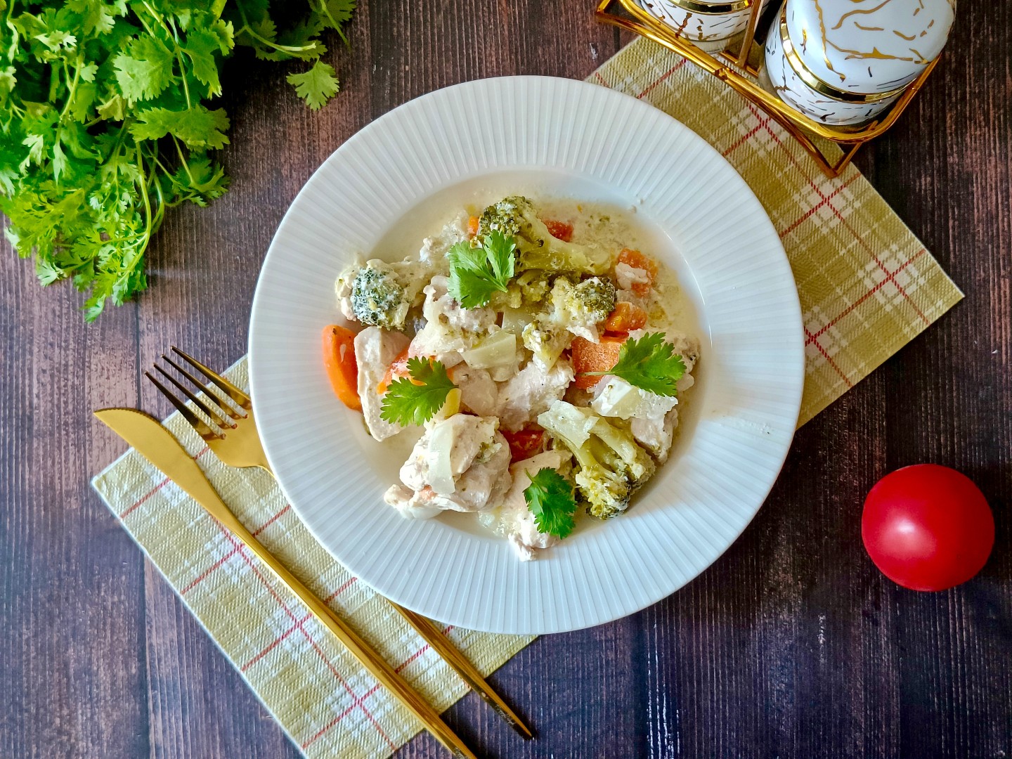 Разложите тушеную курицу с брокколи в сливочном соусе по тарелкам и подайте к столу с гарниром или как самостоятельное блюдо. Приятного аппетита!