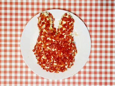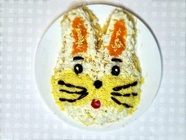 Слегка смажьте салат сверху и с боков майонезом и обсыпьте яичными белками. Часть ушек кролика я украсила вареной морковью. Остальную морковь перемешала с небольшим количеством майонеза и сформировала бантик. Из маслин можно сделать глазки и носик, ротик - из кусочка болгарского перца. Мордочку возле носика я присыпала яичным желтком, усы - из веточек зелени. Украшайте салат на свой вкус и по желанию согласно своей фантазии.