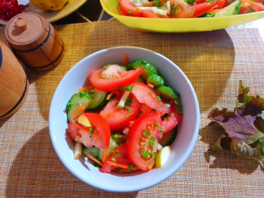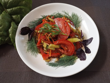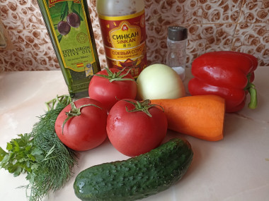 Сделала салат огурцы помидоры морковь. Кроме указанных в названии рецепта овощей, добавила согласно списка ингредиентов репчатый лук, болгарский перец, зелень, получился отличный витаминный набор! Заправила салат оливковым маслом и соевым соусом ( хотя автор делает оговорку, что соевый соус добавляется по желанию, я бы не советовала от него отказываться, настолько получается вкусное и гармоничное сочетание с овощами ). Салат замечательный! Рекомендую приготовить! Спасибо за рецепт, Аля Жемчужинка!