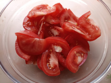Помидоры нарежьте тонкими дольками или кубиками среднего размера. Способ нарезки всех овощей может быть абсолютно любым по вашему желанию. Отправьте томаты в подходящий по размеру глубокий салатник.
