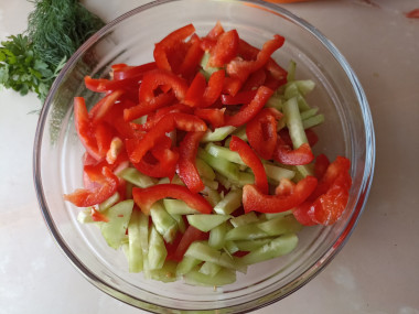 Болгарский перец нашинкуйте тонкими полосками или небольшими кубиками. Отправьте в салатницу.