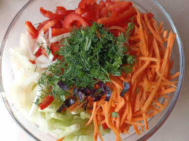 Зелень ополосните, обсушите и нарежьте мелко. Отправьте ко всем овощам. Из зелени для салата отлично подойдут петрушка, укроп, молодой зелёный лук или базилик. Можно использовать несколько видов зелени одновременно. Полейте всё сверху оливковым маслом и соевым соусом.