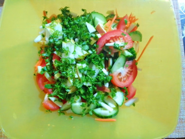 Классический салат это огурцы и помидоры, а вот салат огурцы помидоры морковь я ещё не готовила. В салат нарезала огурцы, помидоры, лук, болгарский перец. Еще порезала соломкой половинку несладкого яблока. Конечно добавила зелень и заправила ароматным подсолнечным маслом. Получился сочный, вкусный, витаминный салат!