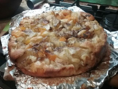 Начать и закончить нужно с мучной смеси. Все перемешиваем венчиком или миксером и тесто готово. Подготовительная работа окончена и мы подошли к заключительному и самому приятному моменту - выпечке нашего пирога.