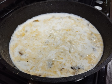 Затем влейте сливки, всыпьте натертый сыр. Огонь сделайте небольшим. При постоянном помешивании дождитесь расплавления сыра.