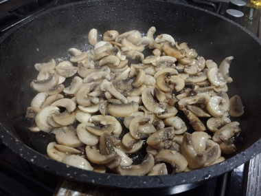 Выложите в сковороду грибы. Сразу посолите их — тогда грибы пустят сок и не подгорят. Жарьте шампиньоны, помешивая, до испарения жидкости.
