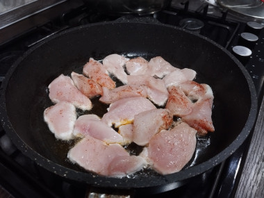 Разогрейте на сильном огне сковороду. Налейте на нее растительное масло для жарки. Выложите в него куриное мясо. Обжаривайте кусочки 6-7 минут, до румяности, время от времени переворачивая их. Готовность проверьте острым ножом — из самого толстого места в месте прокола будет вытекать прозрачный, а не розовый сок. Снимите мясо со сковороды.