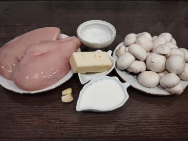 Приготовила на ужин куриные грудки в сливках на сковороде. Филе нарезала средними кусочками и обжарила на сковороде. Выложила в тарелку. Зубчики чеснока порезала на части и обжарила на сковороде для аромата. Чеснок после обжарки убрала.Грибы порезала пластинками и обжарила в сковороде, добавила сливки, натертый сыр, затем филе. Немного потомила вместе.