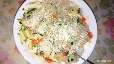 Фунчоза - это лапша из крахмала, ее еще называют стеклянной лапшой, поскольку в готовом виде она становится полупрозрачной. Для ее изготовления используется крахмал бобовых, маниока, картофеля, канны, риса, но лучшим традиционным сырьем для фунчозы является крахмал из маша — золотистой фасоли. Вот вам несколько интересных фактов об одном из ингредиентов салата!