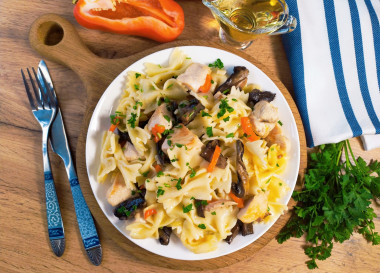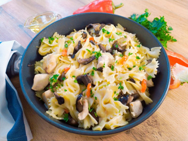 На ужин решила приготовить макароны с курицей и грибами, для этого блюда выбрала замороженные шампиньоны, которые лежали у меня в морозилке. Мне очень понравилось как аппетитно на фото выглядят макароны, поэтому решила взять в магазине тоже в форме "бабочек" 🙂
