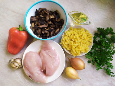 Как сделать макароны с курицей и грибами? Подготовьте все продукты по списку. Шампиньоны можно заменить лесными грибочками, отваренными предварительно. Вместо воды допустимо взять куриный бульон или сливки. Куриную грудку можно заменить на филе индейки.