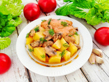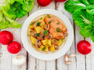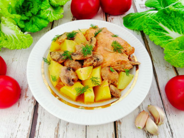 Получилось очень ароматно и вкусно! Картошечка вышла мягкая, рассыпчатая, грибочки - сочные, мясо - нежное, легко отделяющееся от косточки.