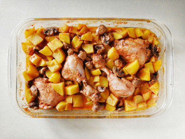 Для запекания можно взять любую жаропрочную форму. Я беру керамическую. Дно и бока формы смажьте растительным маслом и переложите курицу с картофелем и грибами. Равномерно все распределите по всей форме. Поставьте в духовку, предварительно разогретую до 190 градусов на 1 час. Ориентируйтесь по своей духовке.