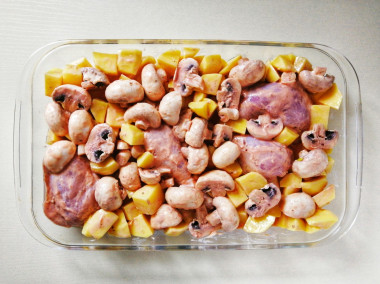 Сделала на второе картошку с шампиньонами и курицей. Два окорочка разрезала на части, удалила с них кожу, переложила в глубокую миску. Туда же отправила нарезанную картошку и соус из сметаны и томатной пасты, приправленный чесноком, солью и специями (у меня были итальянские травы).