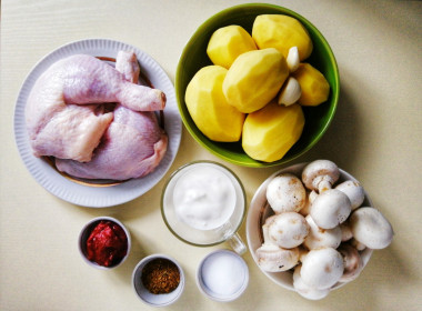 Как сделать картошку с шампиньонами и курицей? Подготовьте для этого необходимые ингредиенты. Для приготовления можно использовать любые части курицы или взять целую курицу и порубить её на части. Я буду готовить с куриными голенями. Сметана может быть любой жирности. Её вполне можно заменить на майонез.