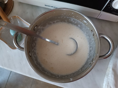 Отдельно нагрейте молоко до горячего состояния. Затем влейте горячее молоко и добавьте растительное масло. Все еще раз хорошо смешайте.