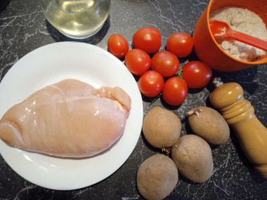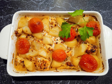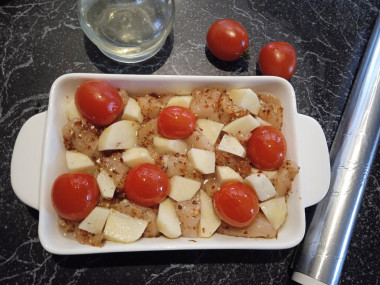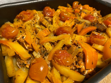 Угостили меня помидорами черри и было куриное филе в морозилке. Искала по ингредиентам на любимом сайте, что можно приготовить. Этот рецепт мне понравился. И просто, и быстро, и выглядит обалденно. Готовила блюдо на романтический ужин на 2 порции, уменьшив количество продуктов с помощью калькулятора сайта, это так удобно! Единственное, что болгарский перец не добавляла. Из специй выбрала приправу "томат, базилик, чеснок" и соль. Эта приправа идеально дополнила куриное филе и картошку. Сложила в форму замаринованное куриное филе и картошку, целые помидорки черри. Ещё немного присолила и сбрызнула маслом по совету автора. Готовила под фольгой 40 минут и без фольги 20 минут. Аромат сногсшибательный! Филе получилось нежное и ароматное, картошка просто тает во рту, а запечённые помидорки черри просто нет слов, они такие вкусные. В следующий раз положу побольше)