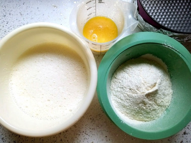 Затем всыпьте оставшуюся половину муки, за ней влейте молоко.