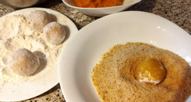 Для панировки понадобится: 75 г панировочных сухарей; 50 г муки; 1 крупное яйцо. И примерно 300 мл растительного масла для обжарки крокетов во фритюре.