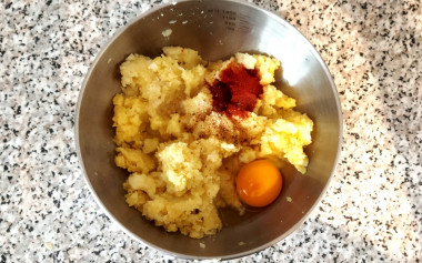 В картофельное пюре вбейте яйцо. Добавьте паприку и перец. Если картофель после варки несоленый, досолите.