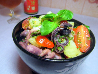 Калорийность продуктов: Осьминог, Листья салата, Картошка, Помидоры, Чесночный порошок, Смесь трав, Растительное масло, Оливковое масло, Винный уксус белый, Горчица зернистая, Соль