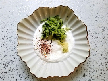 Переложите натертые огурцы в мисочку, лишнюю жидкость лучше отожмите. Зубчики чеснока очистите и выдавите к огурцам. Можете также натереть его на мелкой терке, если у вас нет пресса. Посолите и поперчите, а затем перемешайте массу. При желании вы можете добавить любую мелко нарезанную зелень — укроп, петрушку, кинзу. Смотрите по своему вкусу или наличию.