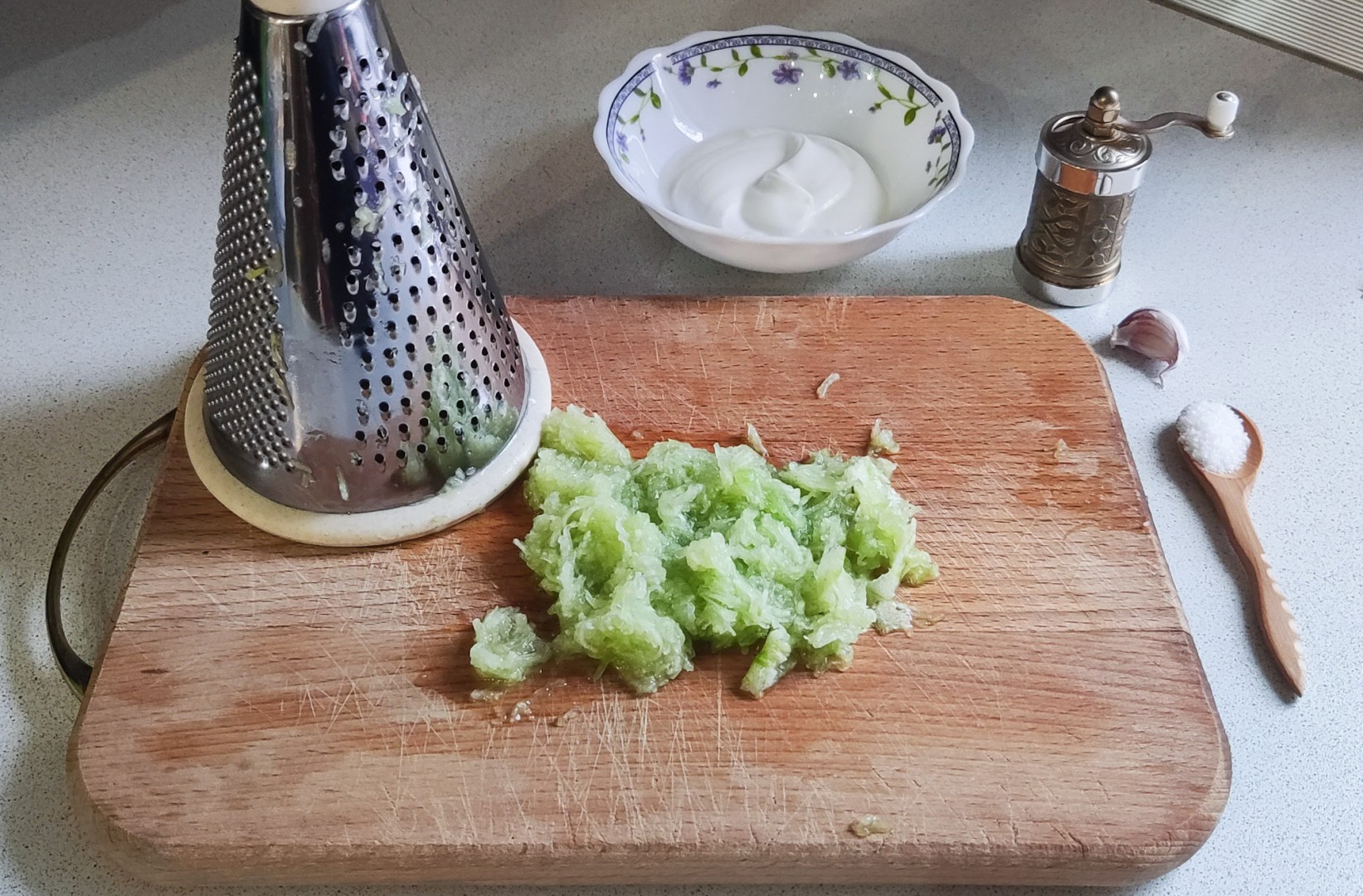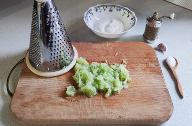 Огурцы хорошо помойте, отрежьте кончики. Обязательно попробуйте их, не горчат ли — такие плоды испортят своим вкусом блюдо. Если огурцы сильно зрелые, с крупными семенами, то снимите с них кожицу и выскребите ложкой серединку с семенами. Натрите огурцы на средней терке. Не на крупной, чтобы соус не получился грубым.